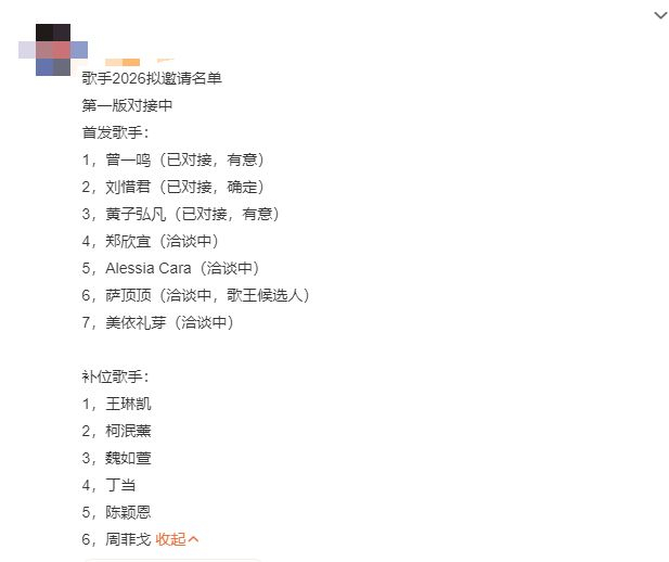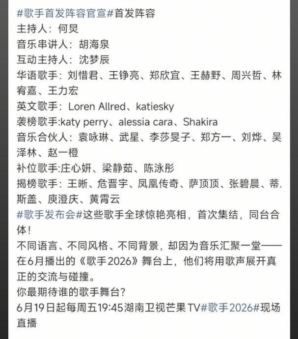 节目未播先火,首发阵容悬念持续发酵!网传海报惊现刘宪华、郑欣宜、美依礼芽等实力唱将,全能唱跳、深情演绎、国际范儿齐聚,网友直呼"这配置是要神仙打架"!更有爆料称节目组正在接触多位神秘大咖,或将打破往届纪录,打造跨世代音乐对决舞台。